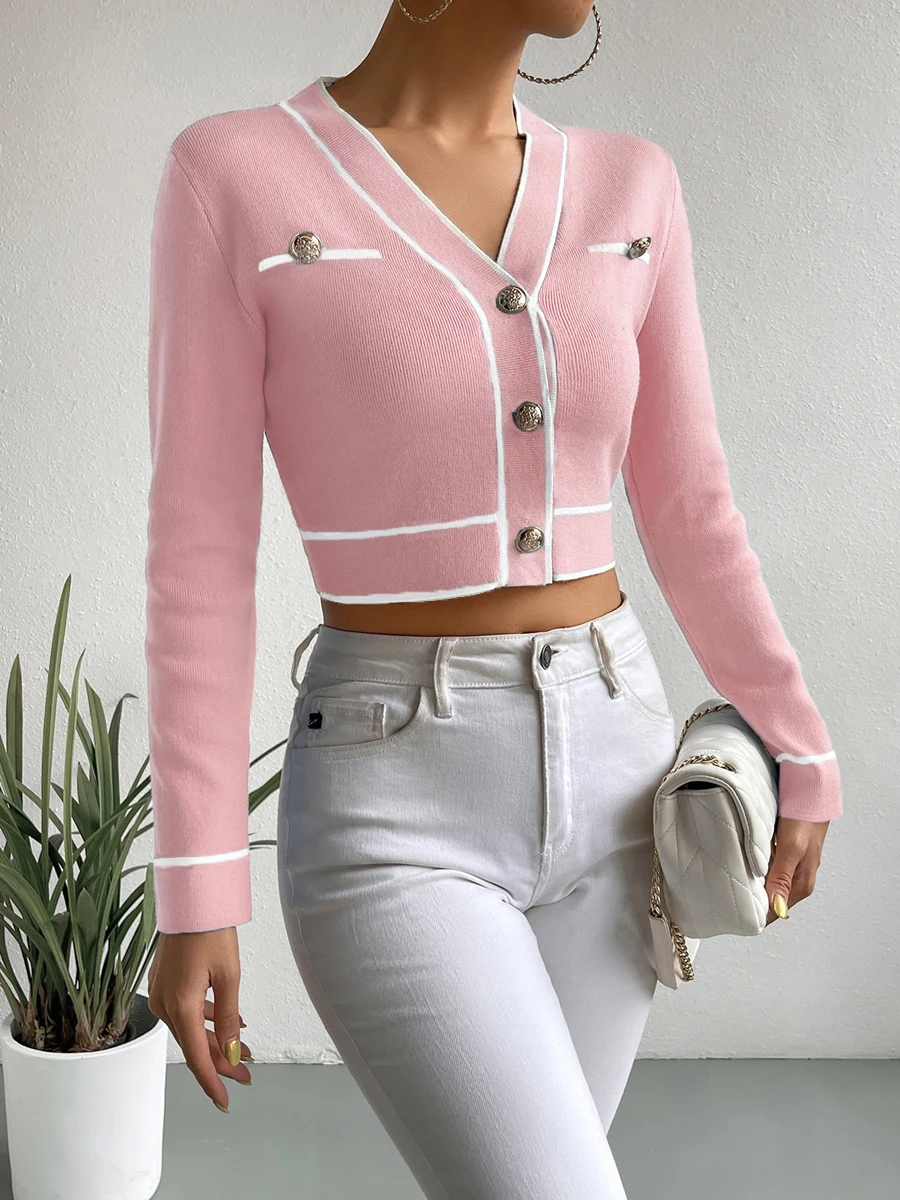 V Neck Button Front Striped Sweater